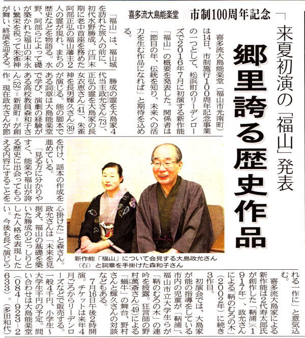 朝日新聞新作能「福山」 あふれる地元愛 喜多流大島家7月初演