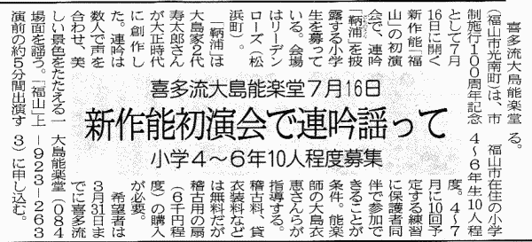 山陽新聞新作能初演会で連吟謡って 小学4~6年10人程度募集