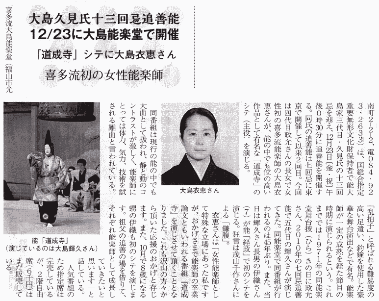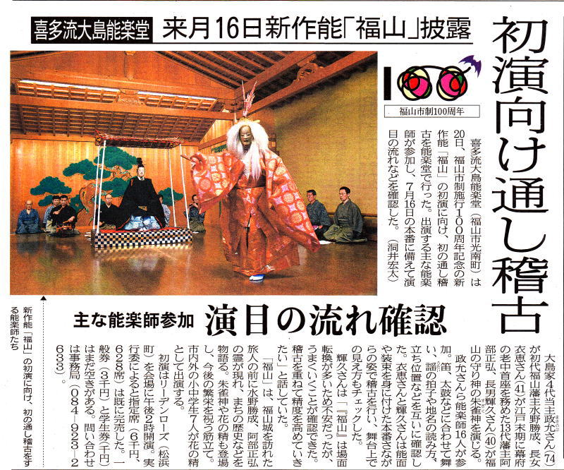 山陽新聞喜多流大島能楽堂 7月初演 新作能ポスター公開